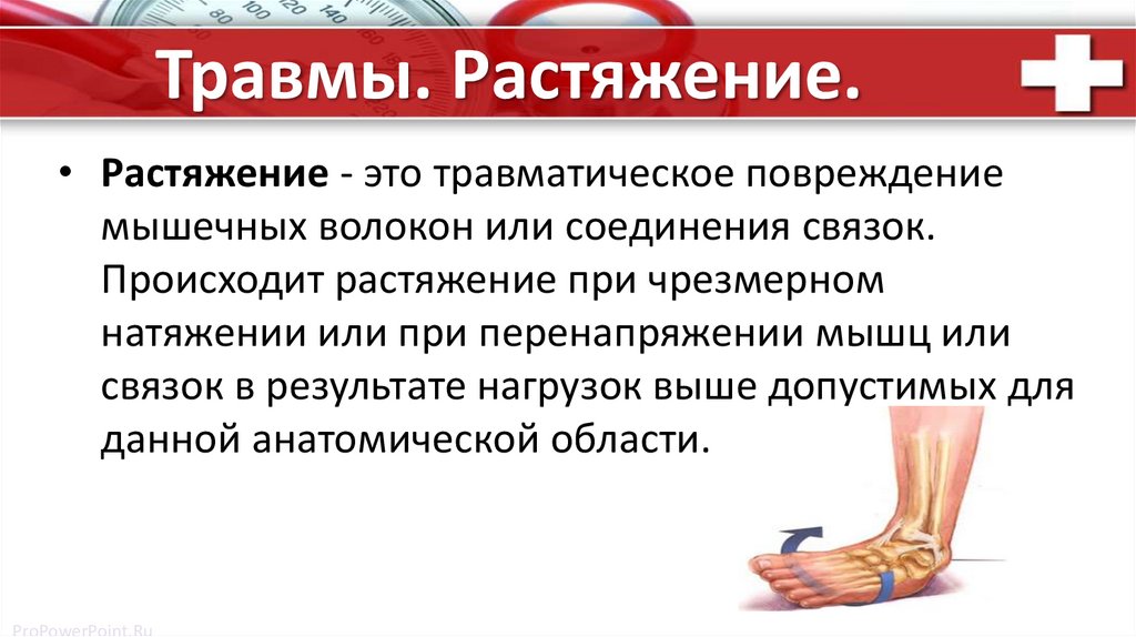 • Растяжение - это травматическое повреждениемышечных волокон или соединения связок.