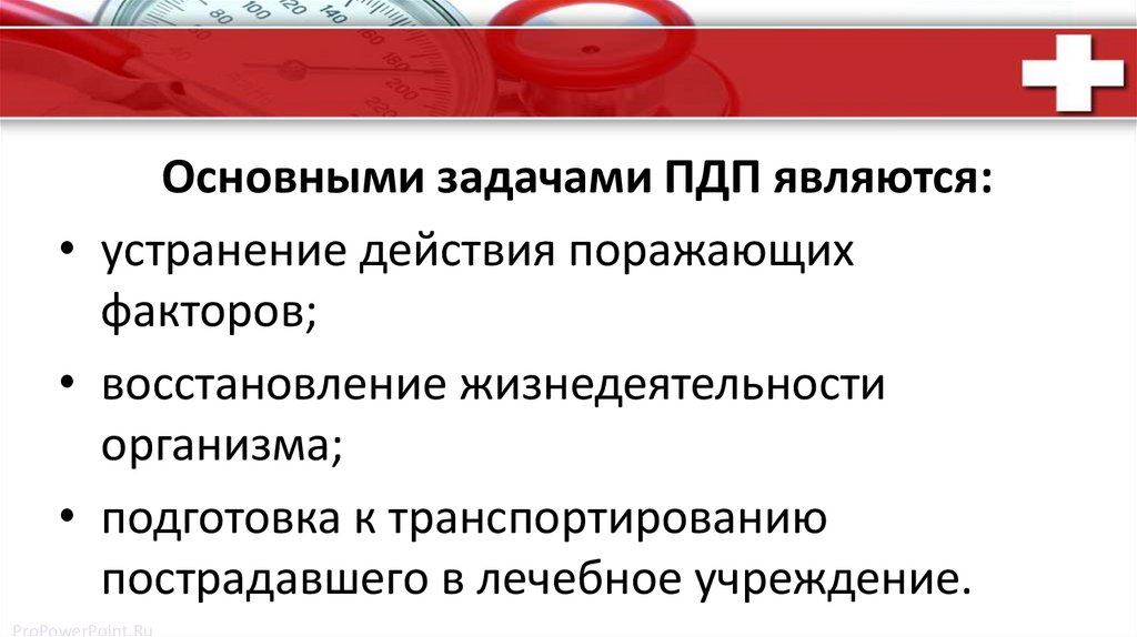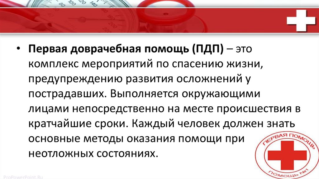 • Первая доврачебная помощь (ПДП) – этокомплекс мероприятий по спасению жизни,