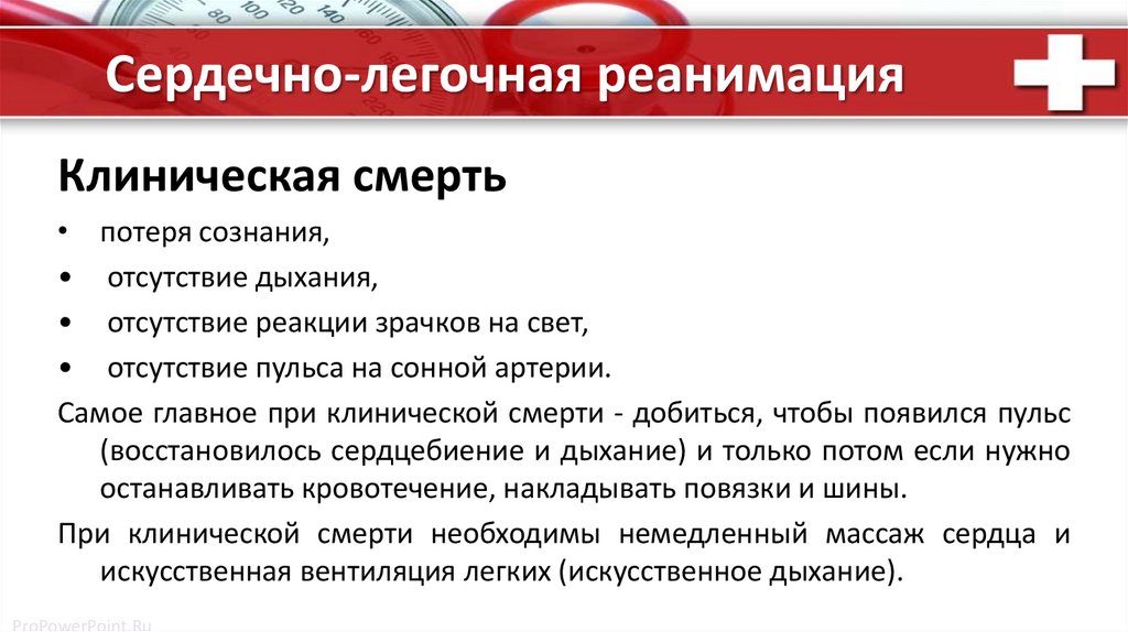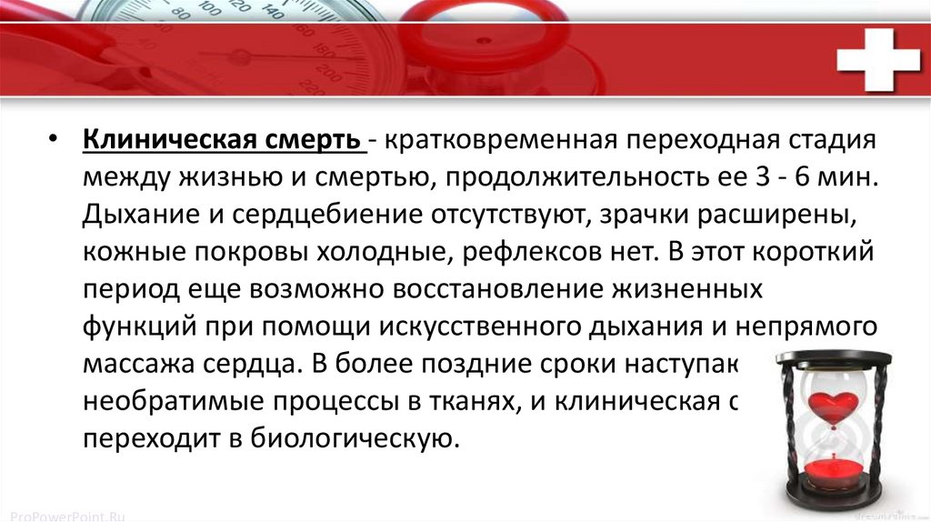 • Клиническая смерть - кратковременная переходная стадиямежду жизнью и смертью, продолжительность ее 3 - 6 мин.