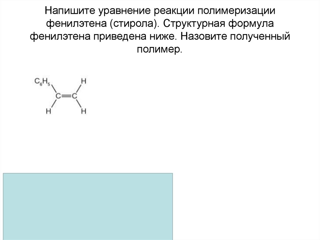12. Напишите уравнение реакции полимеризации фенилэтена (стирола). Структурная формула фенилэтена приведена ниже. Назовите