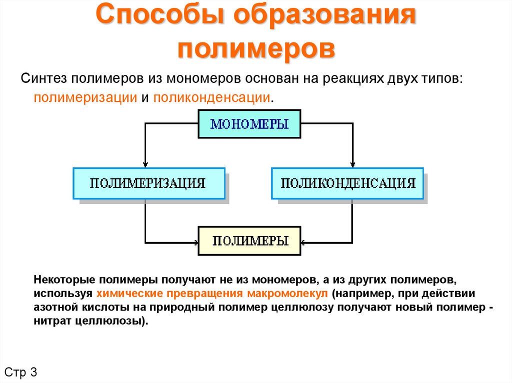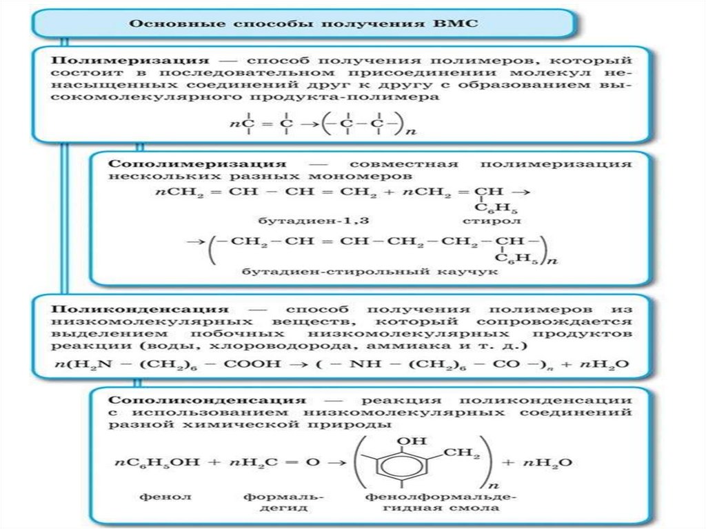 Синтез полимеров из мономеров основан на реакциях двух типов:полимеризации и поликонденсации.
