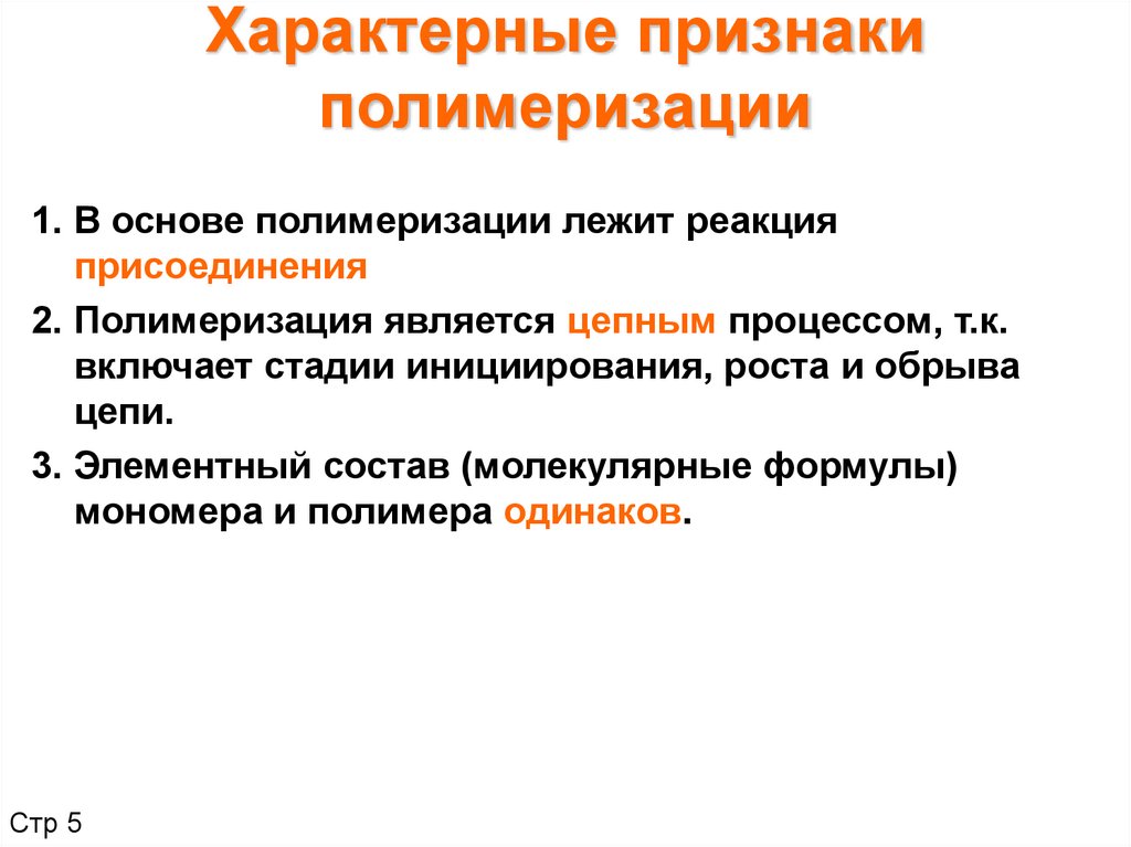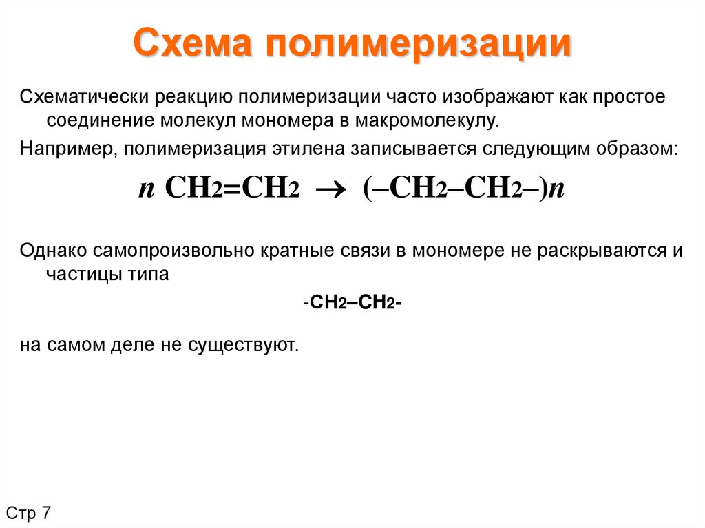 Схематически реакцию полимеризации часто изображают как простоесоединение молекул мономера в макромолекулу.