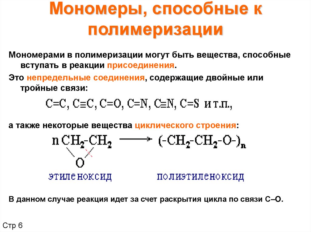 Мономерами в полимеризации могут быть вещества, способныевступать в реакции присоединения.