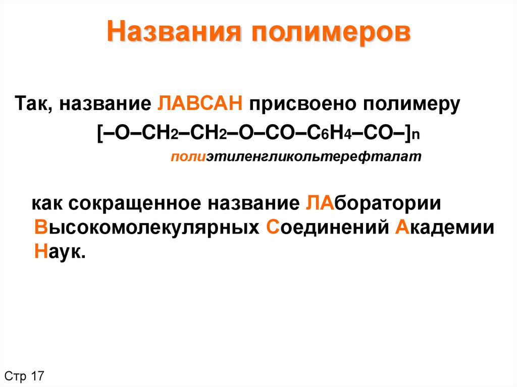 Так, название ЛАВСАН присвоено полимеру[–O–CH2–CH2–O–CO–C6H4–CO–]n