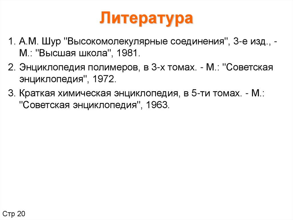Литература1. А.М. Шур "Высокомолекулярные соединения", 3-е изд., М.: "Высшая школа", 1981.