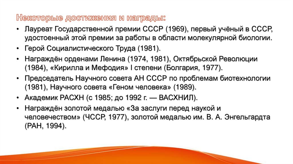 • Лауреат Государственной премии СССР (1969), первый учёный в СССР,удостоенный этой премии за работы в области молекулярной биологии.