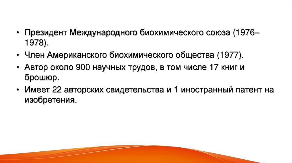 • Президент Международного биохимического союза (1976–1978).