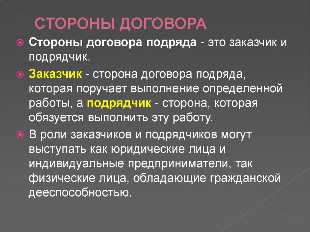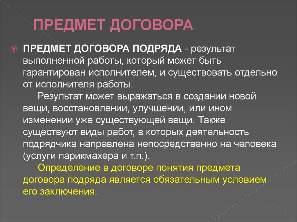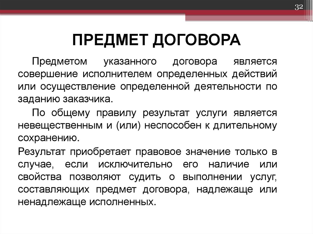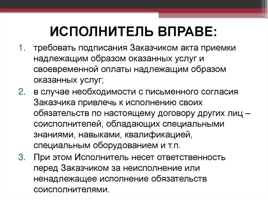 • Предмет договора – услуга,• Личное исполнение имеет важнейшее значение для заказчика. Т.е. он