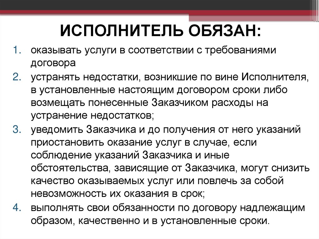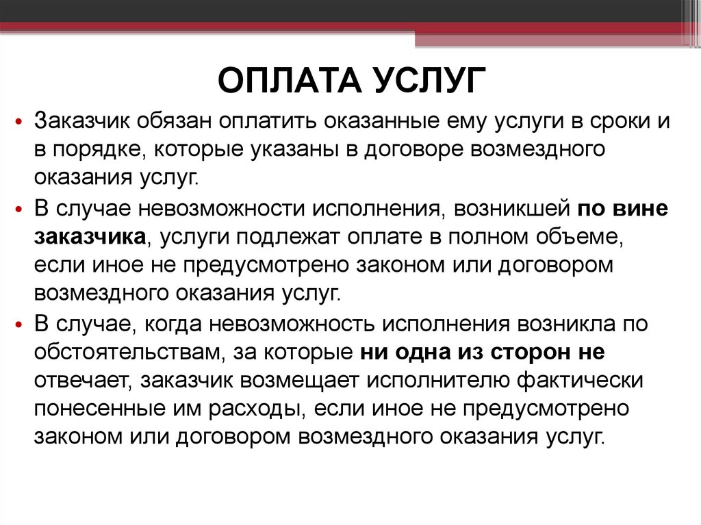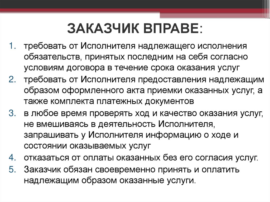 • Заказчик обязан оплатить оказанные ему услуги в сроки ив порядке, которые указаны в договоре возмездного
