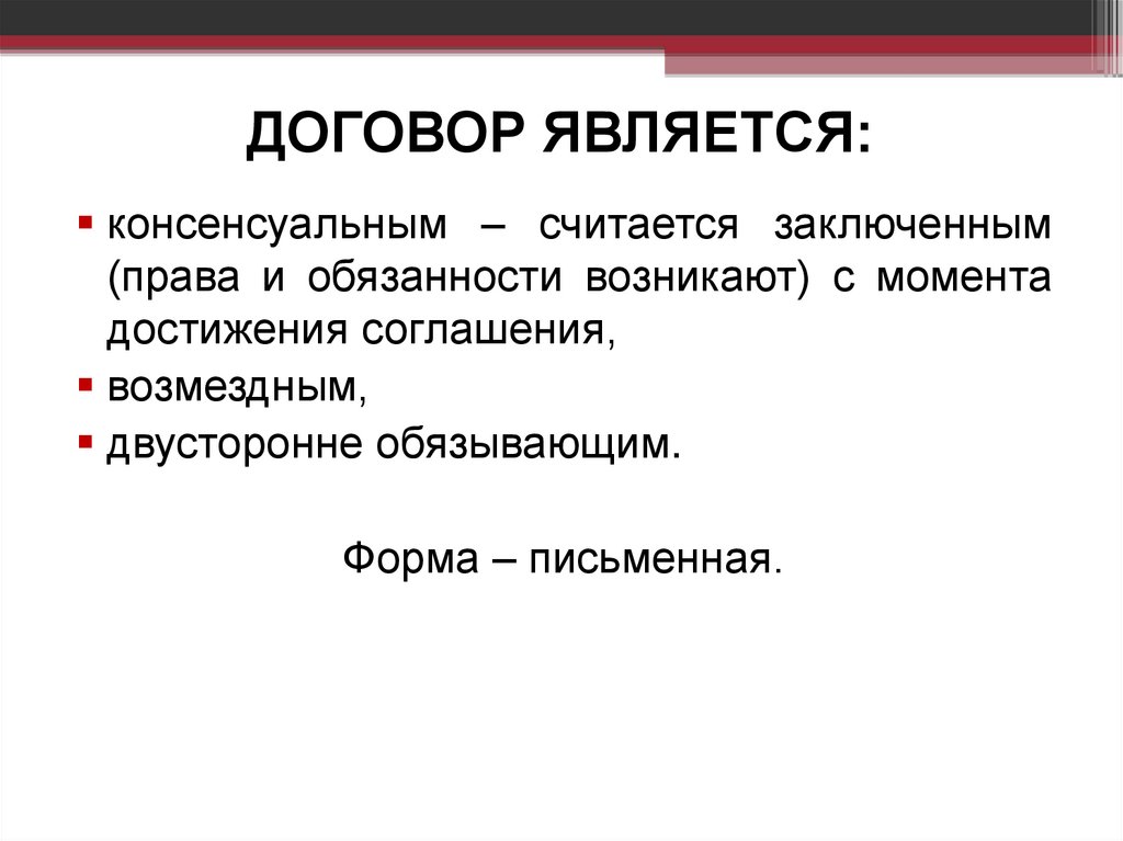 консенсуальным – считается заключенным(права и обязанности возникают) с момента