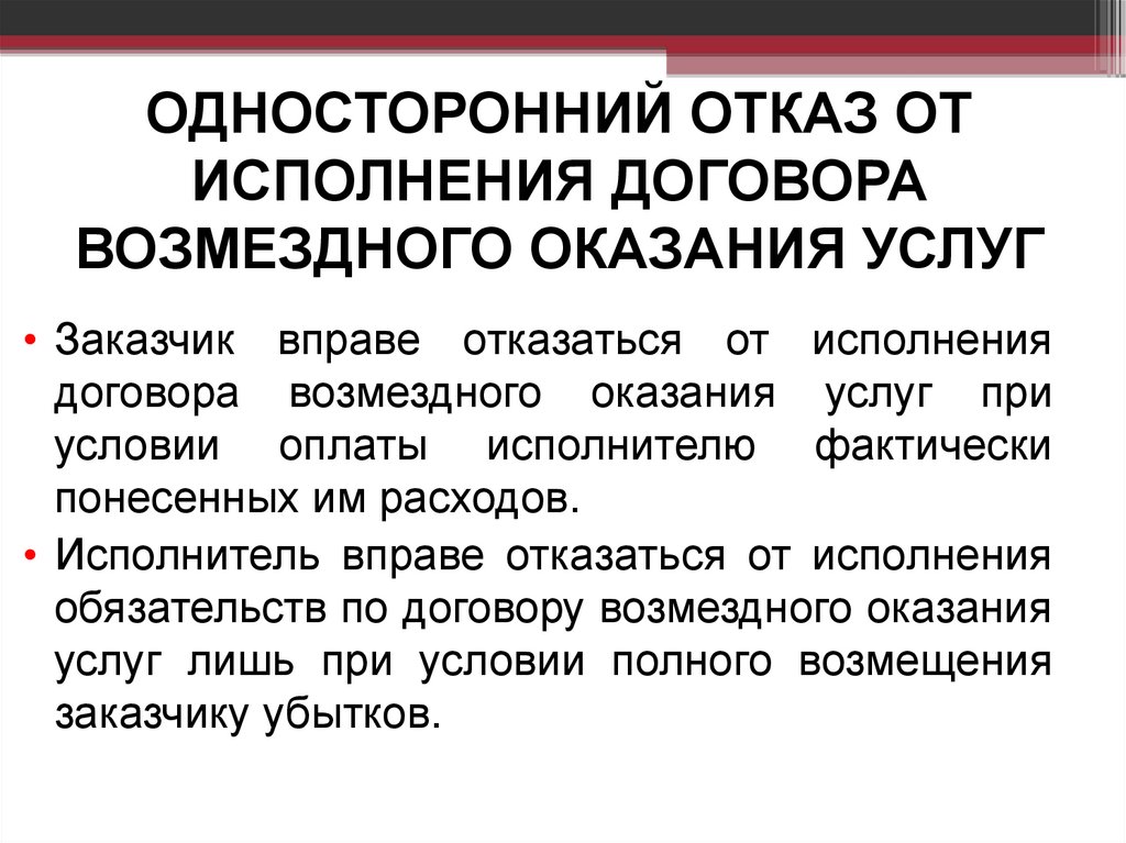 • Заказчик вправе отказаться от исполнениядоговора возмездного оказания услуг при