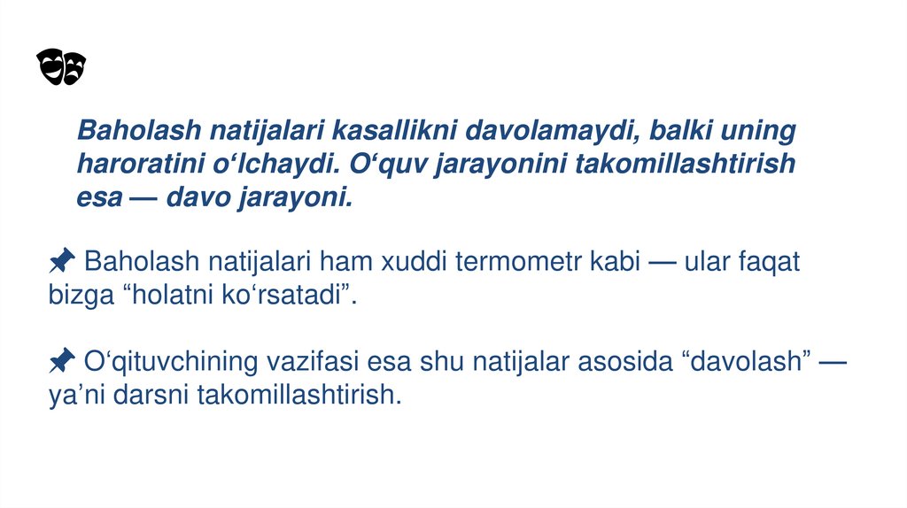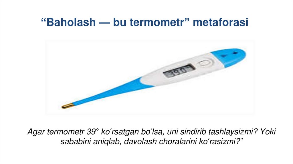 “Baholash — bu termometr” metaforasiAgar termometr 39° ko‘rsatgan bo‘lsa, uni sindirib tashlaysizmi? Yoki