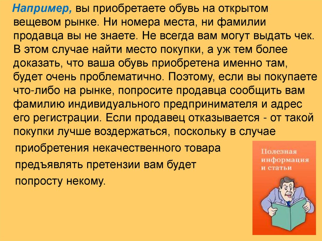 Например, вы приобретаете обувь на открытомвещевом рынке. Ни номера места, ни фамилии