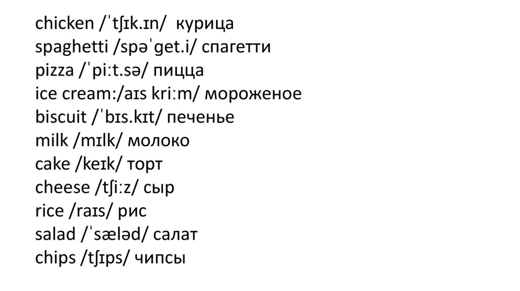 chicken /ˈtʃɪk.ɪn/ курицаspaghetti /spəˈɡet.i/ спагетти