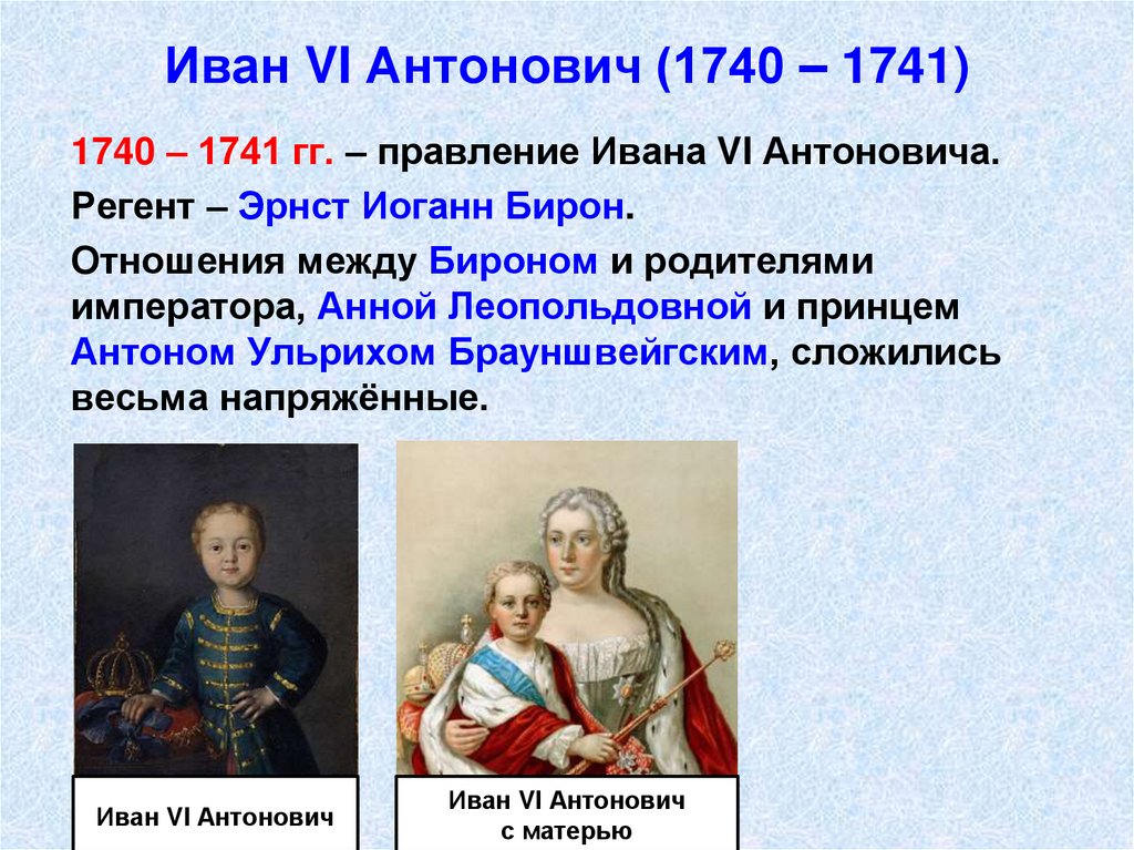 1740 – 1741 гг. – правление Ивана VI Антоновича.Регент – Эрнст Иоганн Бирон.