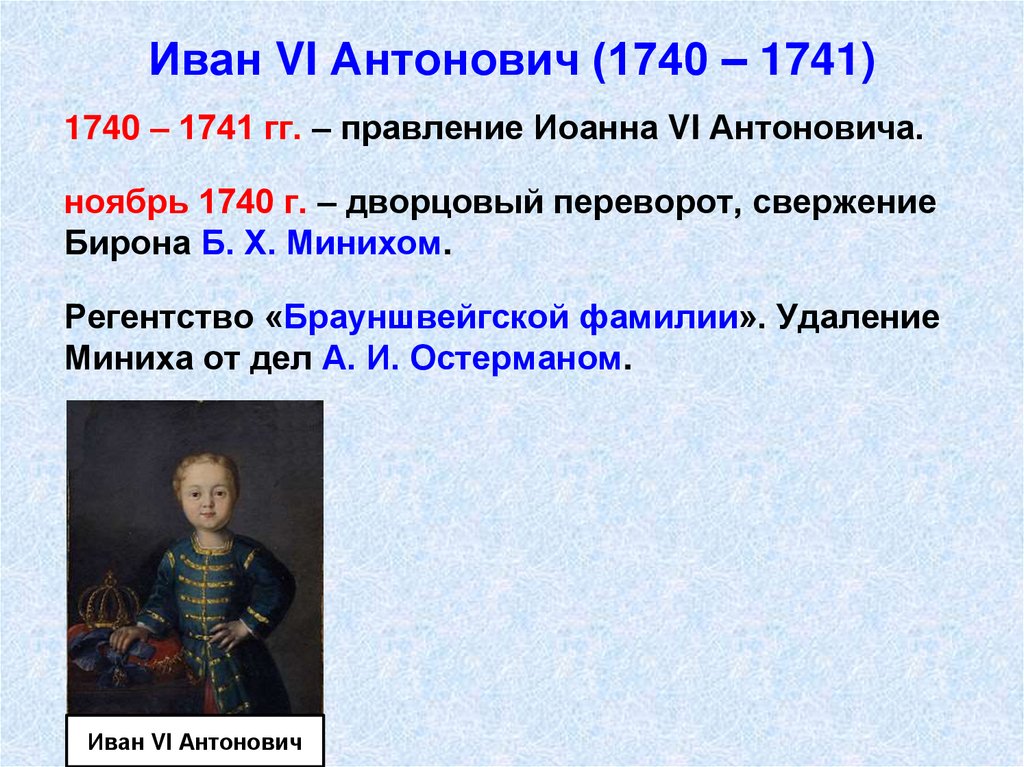 1740 – 1741 гг. – правление Иоанна VI Антоновича.ноябрь 1740 г. – дворцовый переворот, свержение