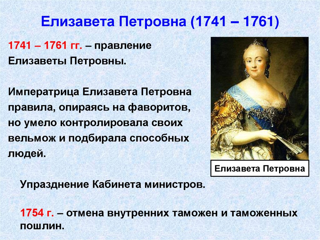 1741 – 1761 гг. – правлениеЕлизаветы Петровны.