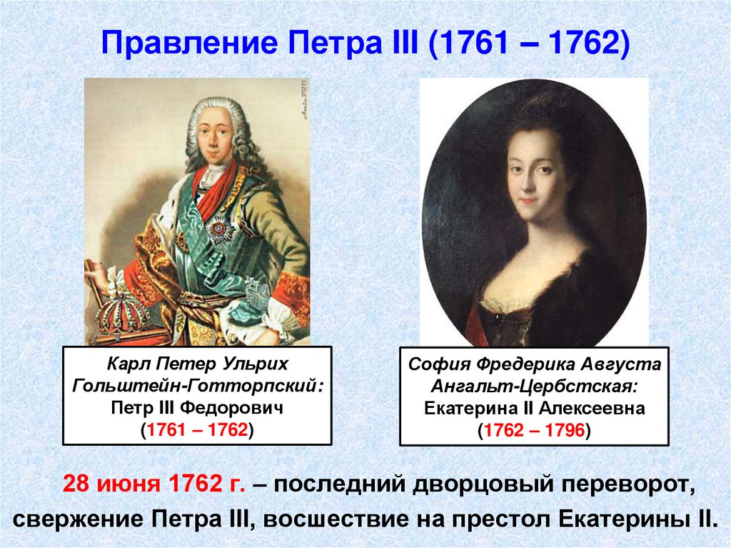 Окончание – 1762 г., воцарение Екатерины II Великой.