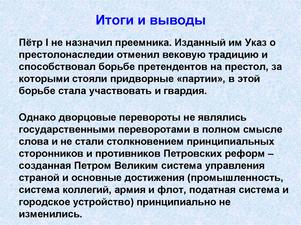 Пётр I не назначил преемника. Изданный им Указ опрестолонаследии отменил вековую традицию и