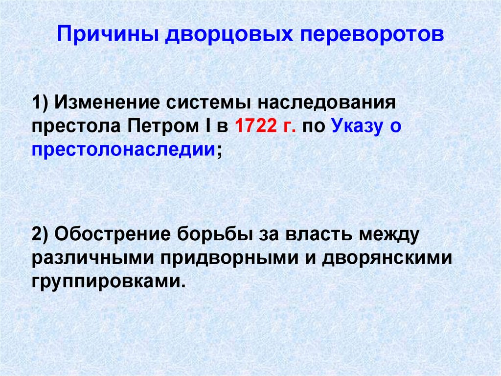 1) Изменение системы наследованияпрестола Петром I в 1722 г. по Указу о