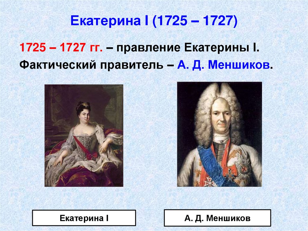 1725 – 1727 гг. – правление Екатерины I.Фактический правитель – А. Д. Меншиков.