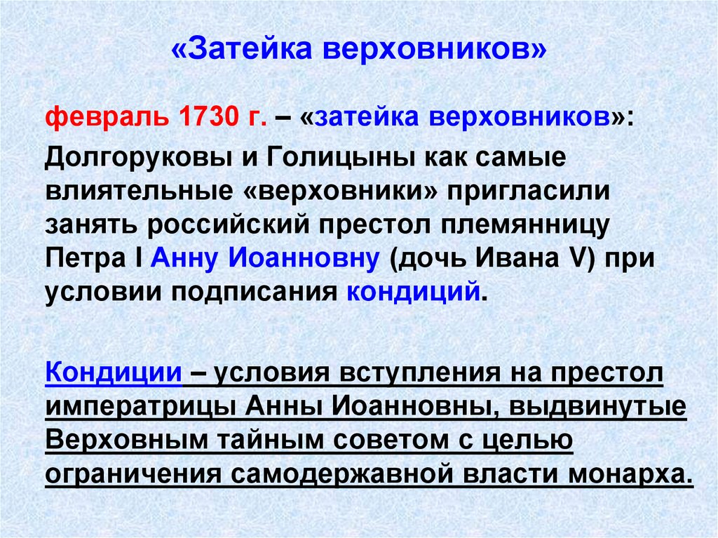 февраль 1730 г. – «затейка верховников»:Долгоруковы и Голицыны как самые