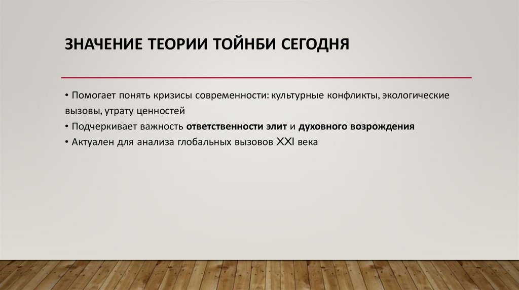 ЗНАЧЕНИЕ ТЕОРИИ ТОЙНБИ СЕГОДНЯ• Помогает понять кризисы современности: культурные конфликты, экологические