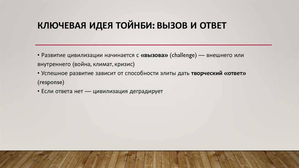 КЛЮЧЕВАЯ ИДЕЯ ТОЙНБИ: ВЫЗОВ И ОТВЕТ• Развитие цивилизации начинается с «вызова» (challenge) — внешнего или