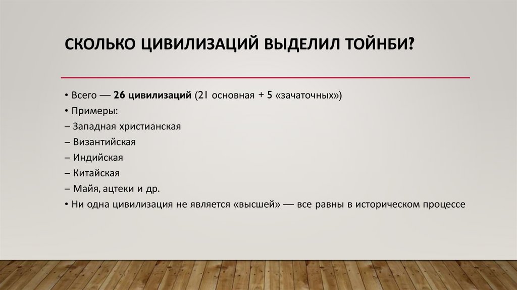 СКОЛЬКО ЦИВИЛИЗАЦИЙ ВЫДЕЛИЛ ТОЙНБИ?• Всего — 26 цивилизаций (21 основная + 5 «зачаточных»)