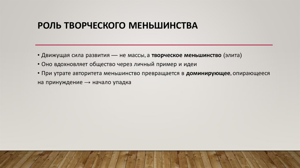 РОЛЬ ТВОРЧЕСКОГО МЕНЬШИНСТВА• Движущая сила развития — не массы, а творческое меньшинство (элита)