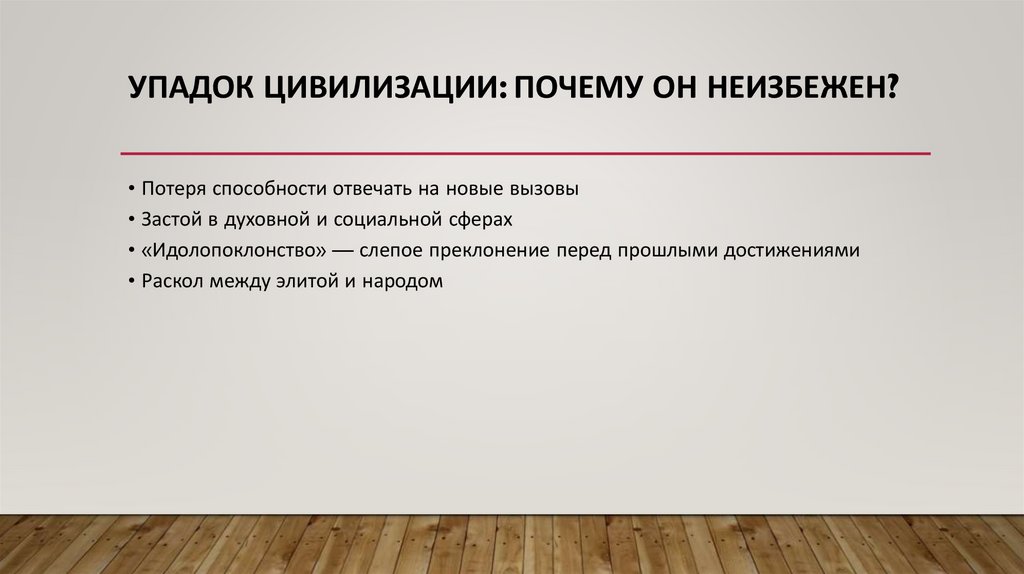 УПАДОК ЦИВИЛИЗАЦИИ: ПОЧЕМУ ОН НЕИЗБЕЖЕН?• Потеря способности отвечать на новые вызовы