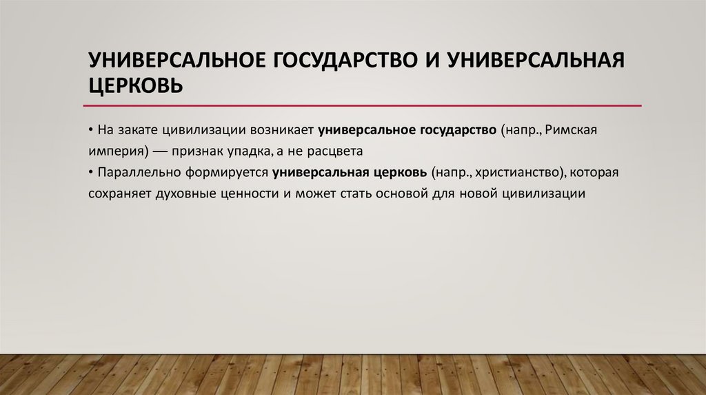 • На закате цивилизации возникает универсальное государство (напр., Римская