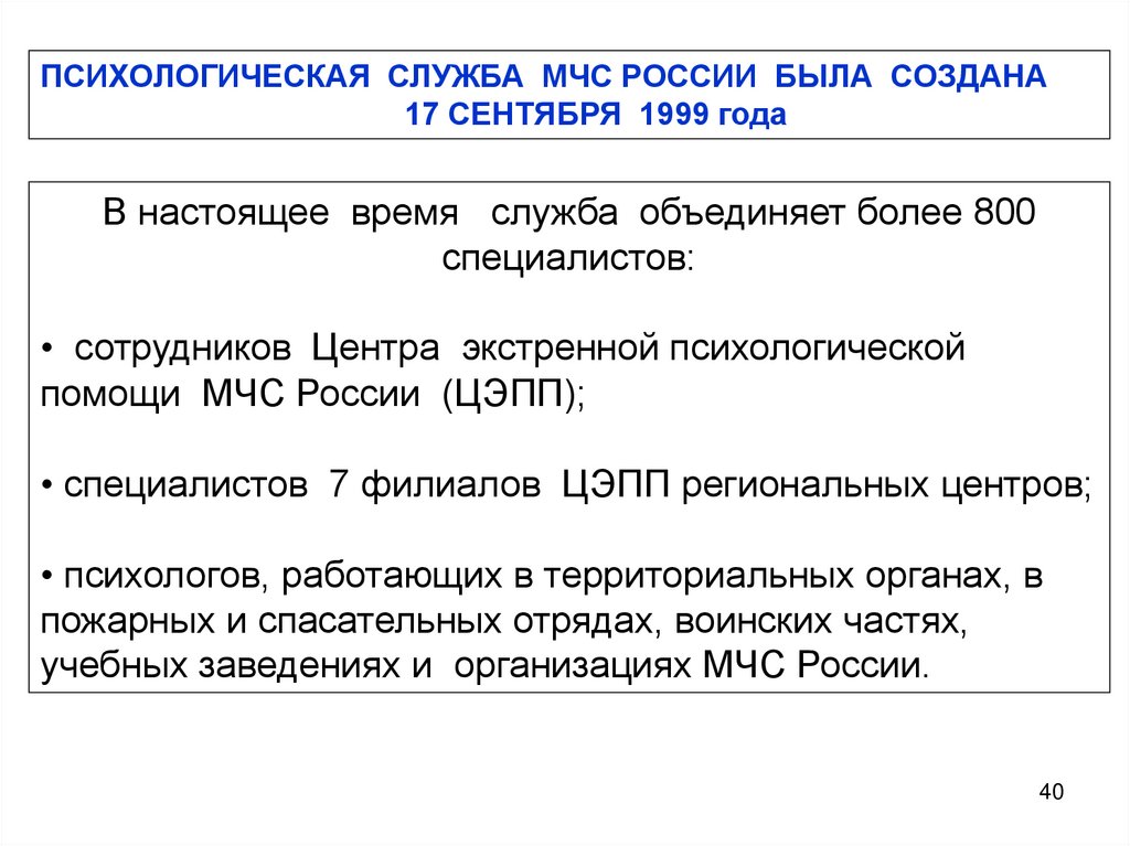 ПСИХОЛОГИЧЕСКАЯ СЛУЖБА МЧС РОССИИ БЫЛА СОЗДАНА17 СЕНТЯБРЯ 1999 года