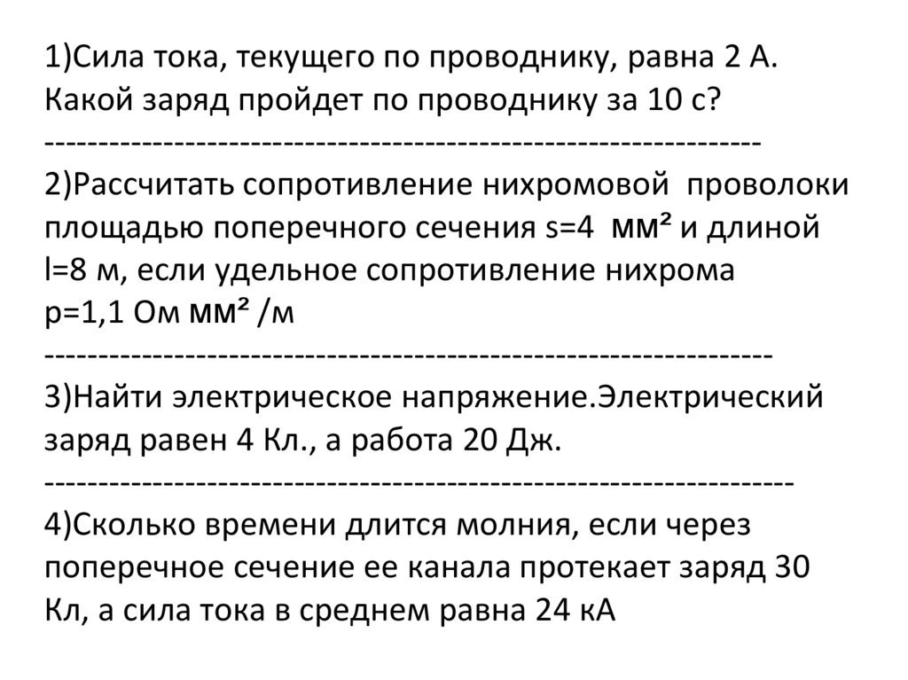 1)Сила тока, текущего по проводнику, равна 2 А.Какой заряд пройдет по проводнику за 10 с?