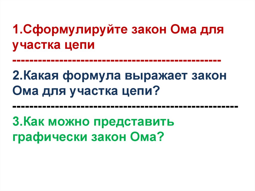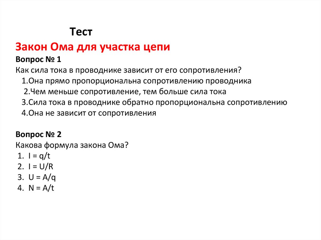 24. Тест Закон Ома для участка цепи Вопрос № 1 Как сила тока в проводнике зависит от его сопротивления? 1.Она прямо