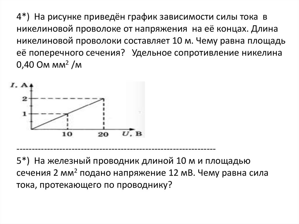4*) На рисунке приведён график зависимости силы тока вникелиновой проволоке от напряжения на её концах. Длина