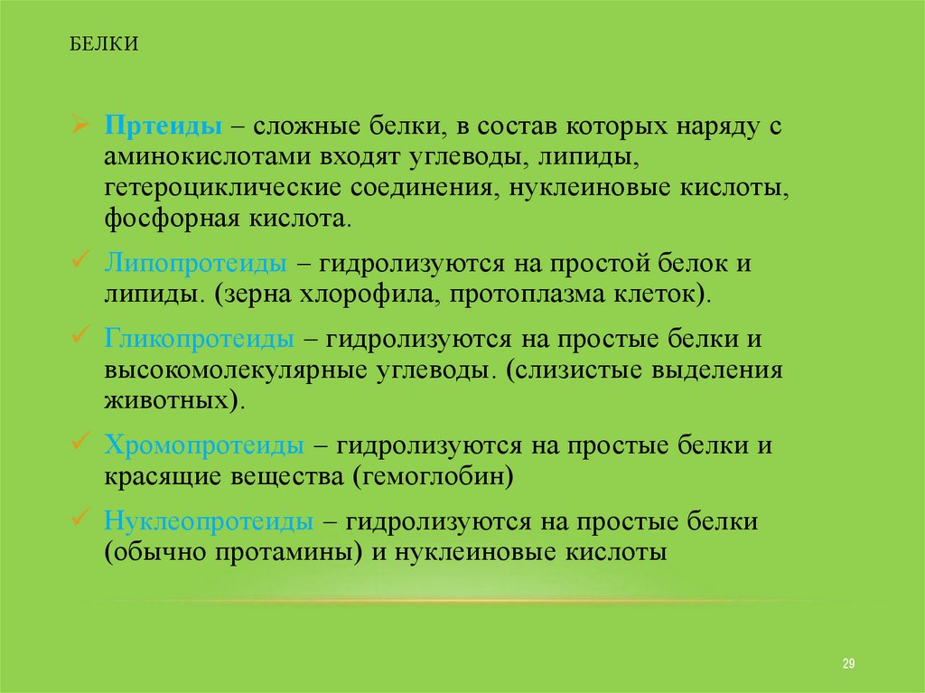 Пртеиды – сложные белки, в состав которых наряду саминокислотами входят углеводы, липиды,