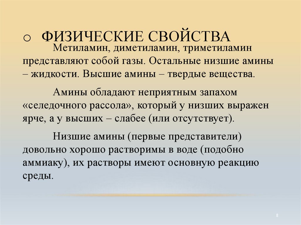 – жидкости. Высшие амины – твердые вещества.
