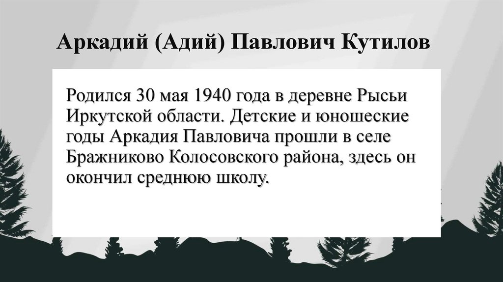 Родился 30 мая 1940 года в деревне РысьиИркутской области. Детские и юношеские