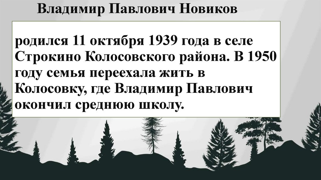 8. Владимир Павлович Новиков родился 11 октября 1939 года в селе Строкино Колосовского района. В 1950 году семья переехала жить в
