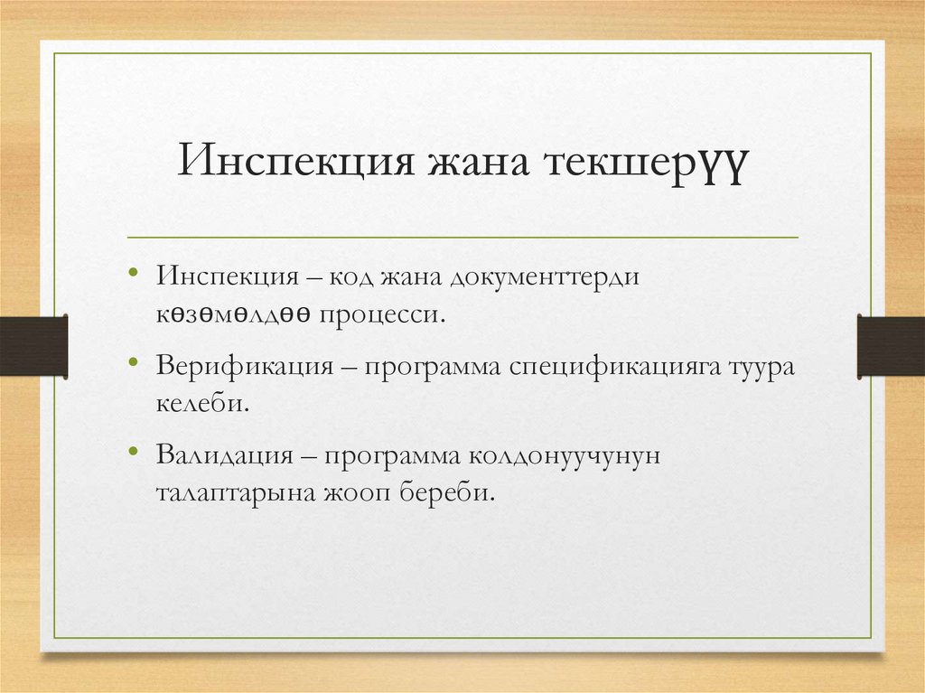 • Инспекция – код жана документтердикөзөмөлдөө процесси.