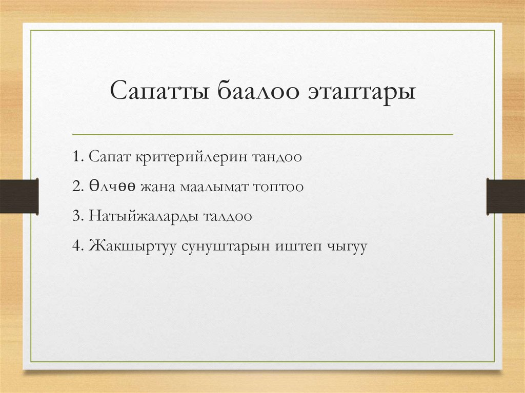 1. Сапат критерийлерин тандоо2. Өлчөө жана маалымат топтоо