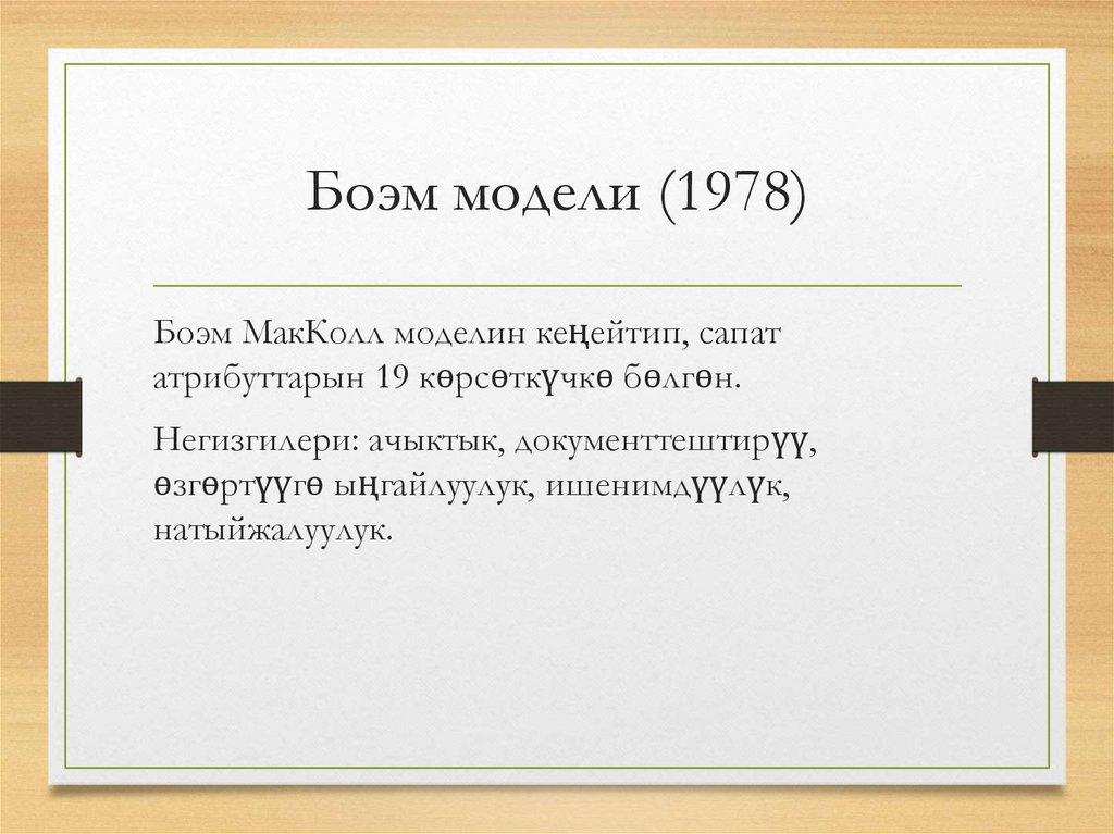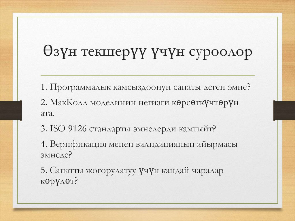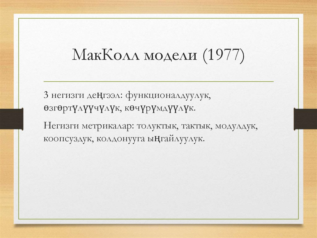 1. Программалык камсыздоонун сапаты деген эмне?2. МакКолл моделинин негизги көрсөткүчтөрүн