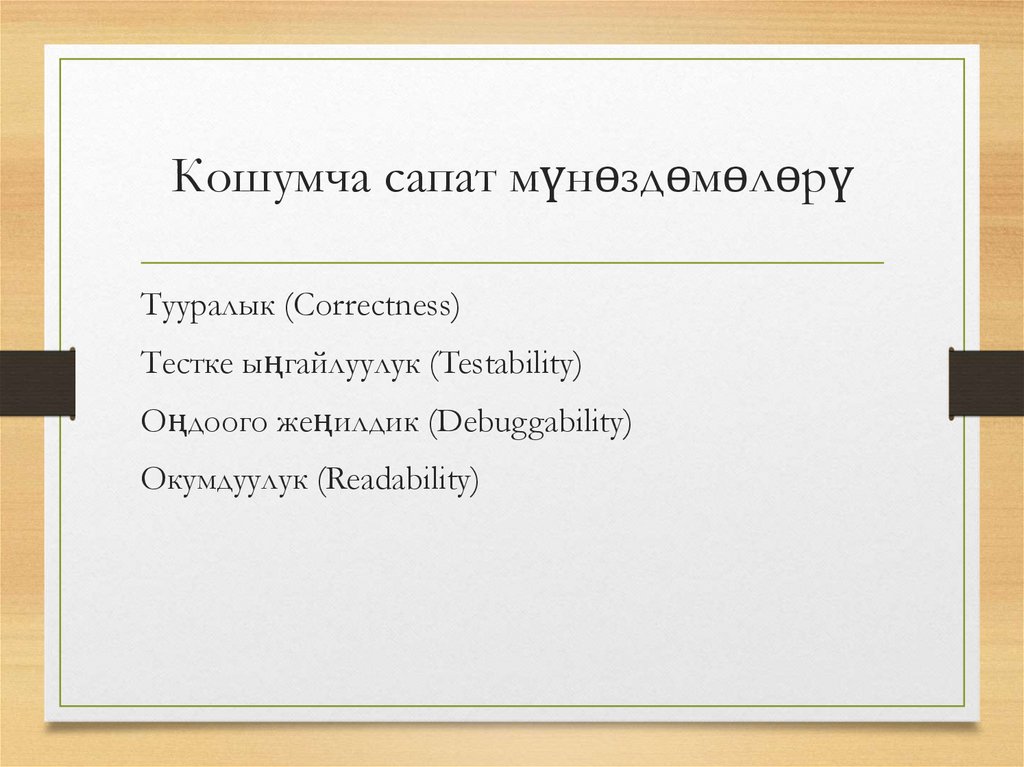 Тууралык (Correctness)Тестке ыңгайлуулук (Testability)