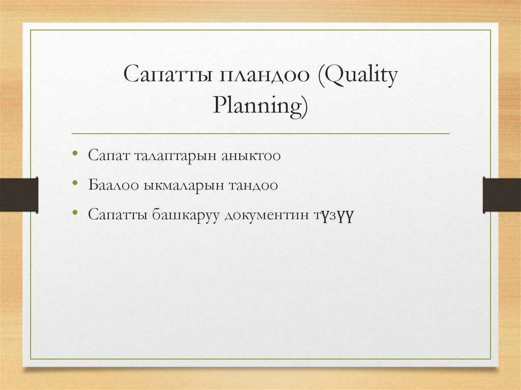 • Сапат талаптарын аныктоо• Баалоо ыкмаларын тандоо