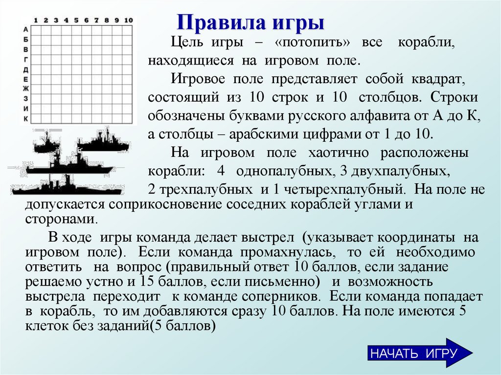 в корабль, то им добавляются сразу 10 баллов. На поле имеются 5