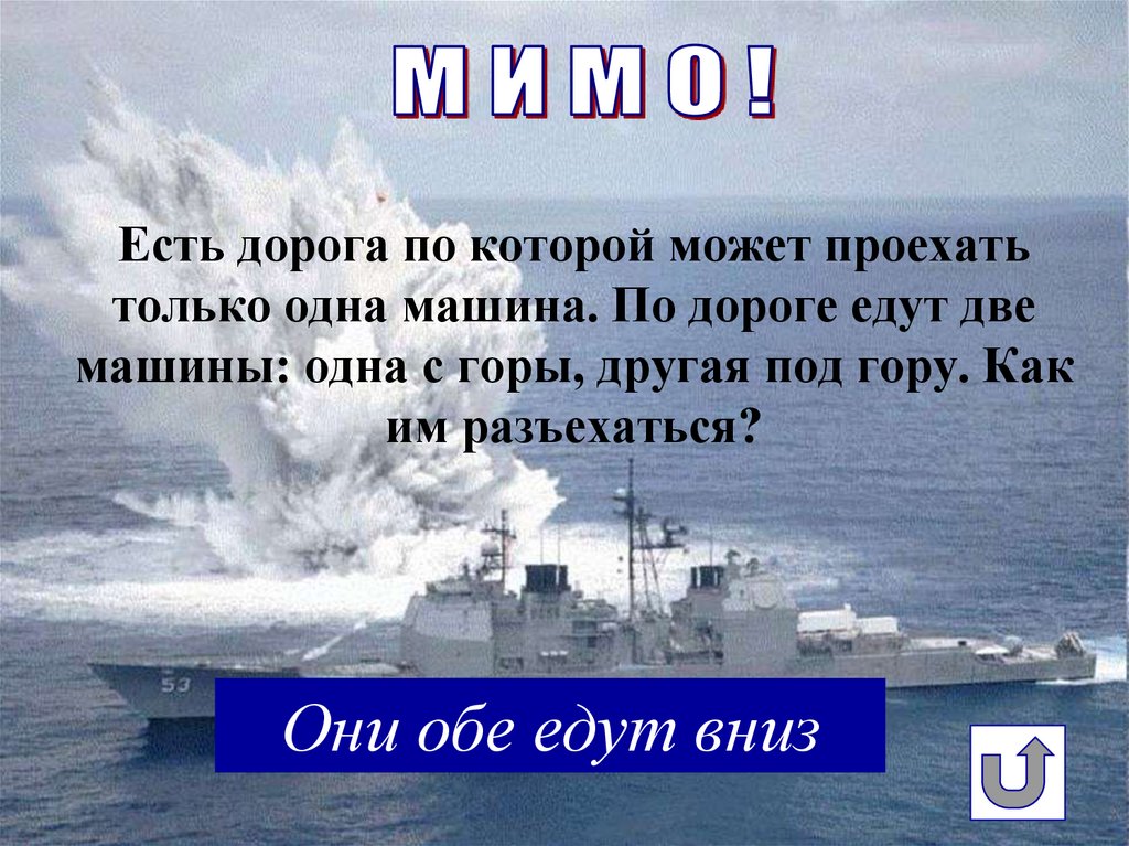 За 5 минут36. Есть дорога по которой может проехать только одна машина. По дороге едут две машины: одна с горы, другая под гору. Как им