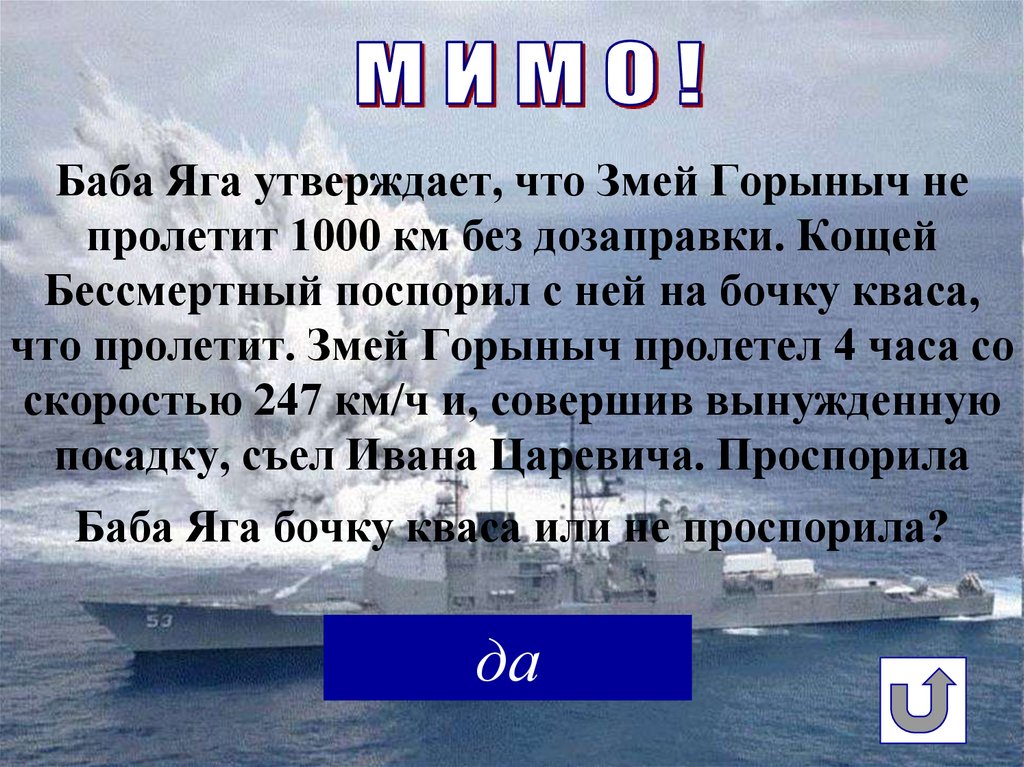 37. Баба Яга утвеpждает, что Змей Гоpыныч не пpолетит 1000 км без дозапpавки. Кощей Бессмеpтный поспоpил с ней на бочку кваса, что