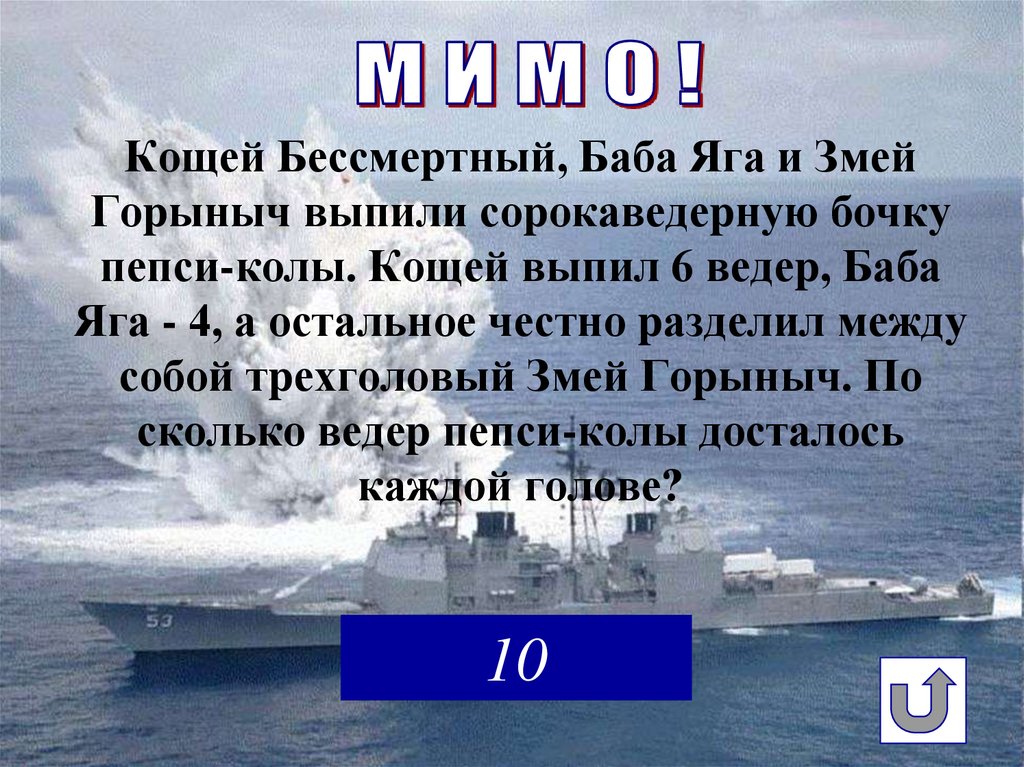 40. Кощей Бессмеpтный, Баба Яга и Змей Гоpыныч выпили соpокаведеpную бочку пепси-колы. Кощей выпил 6 ведеp, Баба Яга - 4, а