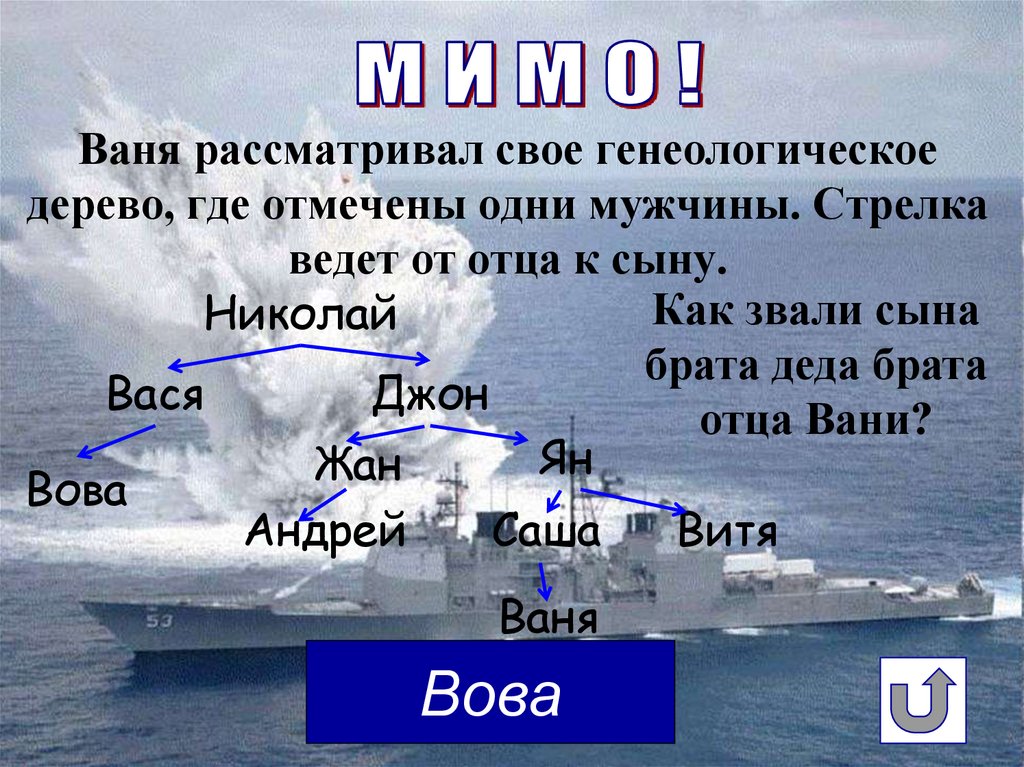 Слагаемое65. Ваня рассматривал свое генеологическое дерево, где отмечены одни мужчины. Стрелка ведет от отца к сыну.
